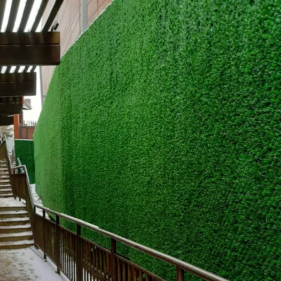 Вечнозеленый сетчатый забор Grass Fence высотой 2 метра гармонично закрыл фундамент опорной стены и придал территории ухоженный и эстетичный вид. Искусственная хвойная текстура ограждения создает эффект плотной зеленой изгороди круглый год, не требуя ухода и полива. Такое решение не только украшает пространство, но и помогает скрыть технические элементы конструкции, делая ландшафт более целостным и привлекательным.